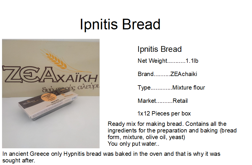 Έτοιμο μείγμα για την παρασκευή ψωμιού. Περιέχει όλα τα συστατικά για την παρασκευή και το ψήσιμο (μορφή ψωμιού, μείγμα, ελαιόλαδο, μαγιά). Προσθέτεις μόνο νερό. Στην αρχαιότητα, οι Έλληνες προσέφεραν ψωμί (το θείο ψωμί) στη θεά Δήμητρα (προστάτη της γεωργίας) κατά τη διάρκεια του εορτασμού των θεσμών. Η τελετή πραγματοποιήθηκε στο ναό της θεάς στην Ελευσίνα και ονομαζόταν επίσης Μεγαλόπολη. Στην αρχαία Ελλάδα, μόνο το ψωμί Υπνίτη ψηνόταν στο φούρνο και γι' αυτό ήταν περιζήτητο.